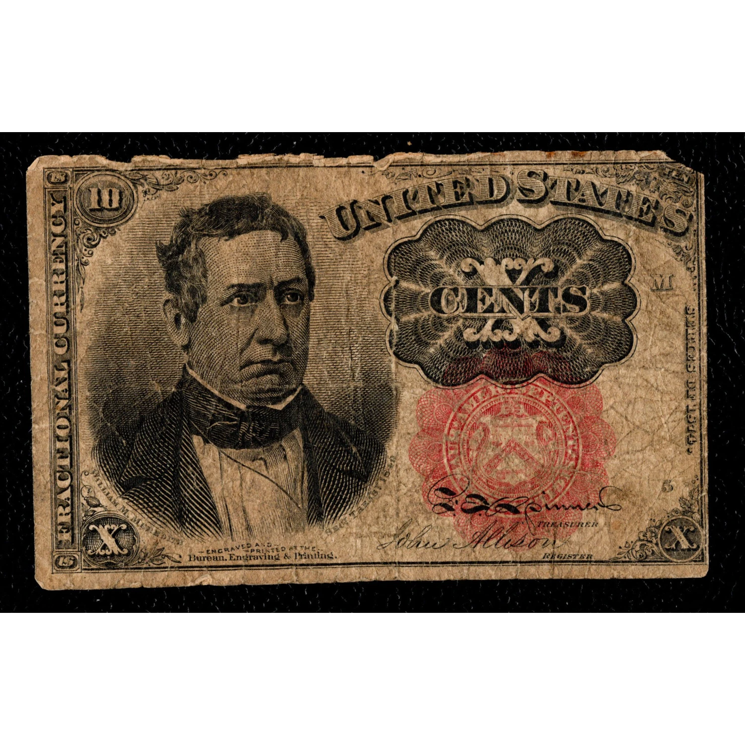 A ten cent, fifth issue fractional featuring William Meredith, Secretary of the Treasury from 1849-1850. This note features the short, thick key within the red treasury seal. No doubt it spent time trading hands, but we're thrilled it's now available to share with the collecting community. As always, please study the provided images to determine if this note would be an ideal addition to your collection.