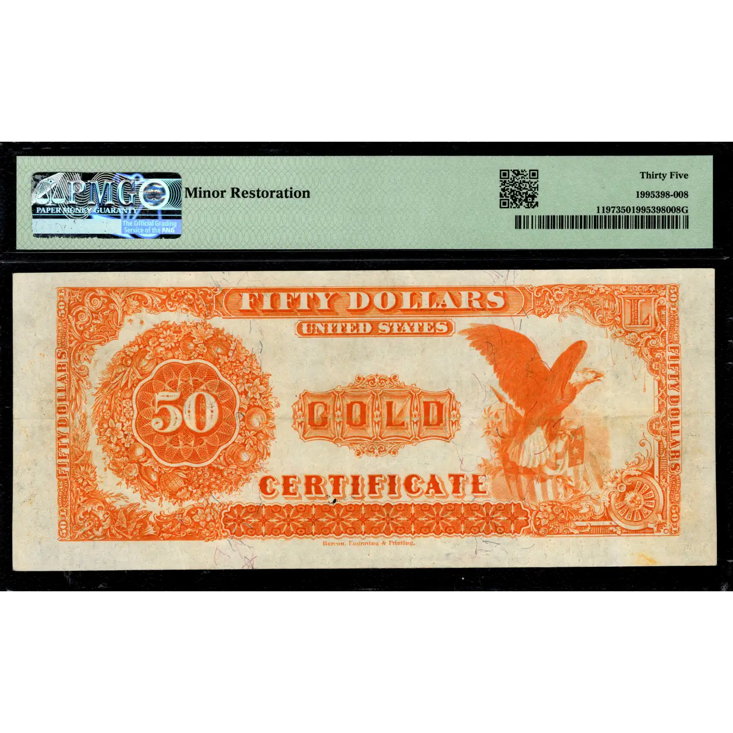 An exceptional note preserved with impeccable eye-appeal. PMG has graded only five pieces above the AU level. This exceptionally well margined example has retained its full colors on both front and back, with a comment of minor restoration that must have only been visible prior to encapsulation. This note has a look that far exceeds its technical grade.