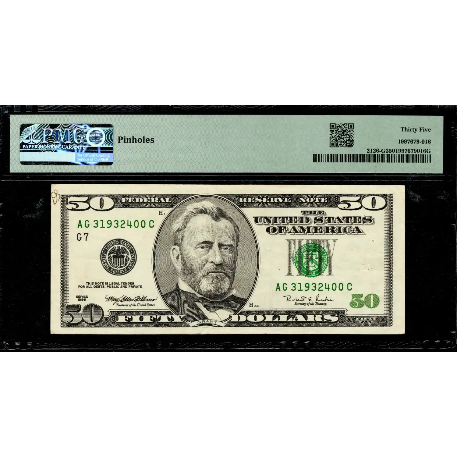 A tough denomination with a dramatic mistake! This Big Head Fifty has a partially flooded plate with horizontal wiper marks present on the back as the excess green ink has obliterated the back design and spans across the U.S. Capitol affecting more than two-thirds of the first/ back printing. An impressive error on any denomination, but to acquire such a dramatic example on a higher and considerably tougher Big Head Fifty will be an impressive addition for a collector. As noted by PMG, there is a small cluster of pinholes on the left end of the note that become visible when the note is backlit, but otherwise remain unobjectionable. It's tough for any problem to supercede this exceptional ink smear, but a little group of pinholes can easily be overlooked on a mistake of this magnitude!