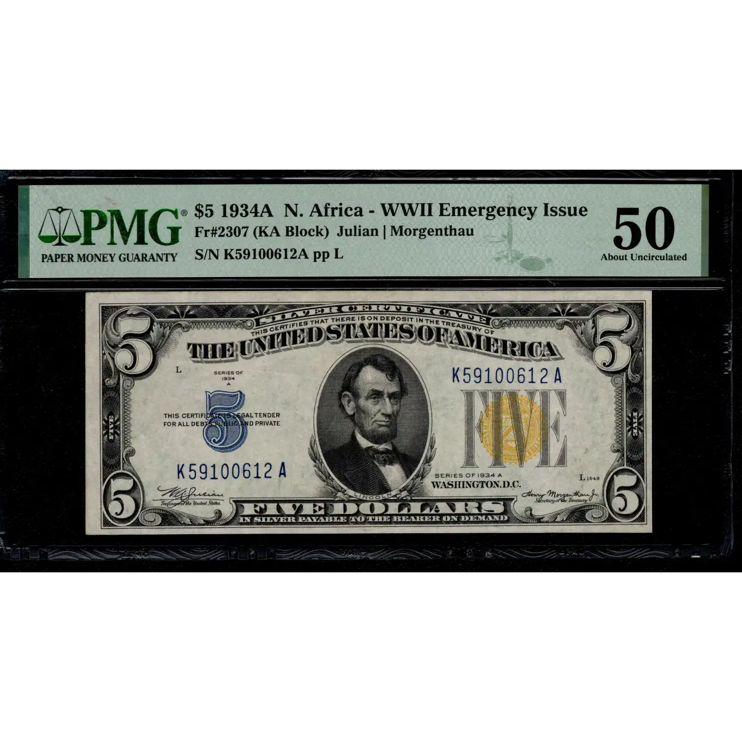This $5 1934-A North Africa Silver Certificate is part of the special WWII Emergency Issue series printed for U.S. troops operating in the North African and Mediterranean theaters. These notes feature the distinctive yellow Treasury seal—a design chosen so that, if large quantities were captured by enemy forces, the U.S. government could easily identify and invalidate them without disrupting the national money supply.