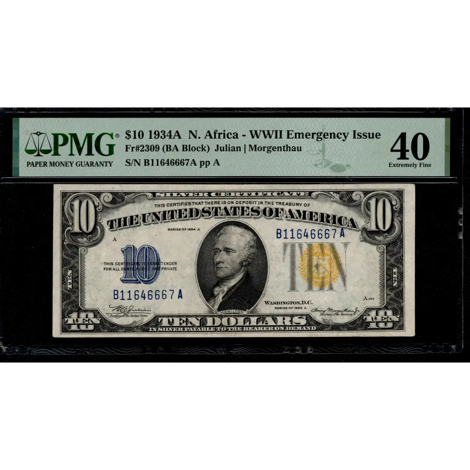 This $10 1934-A North Africa Silver Certificate is part of the special WWII Emergency Issue series printed for U.S. troops operating in the North African and Mediterranean theaters. These notes feature the distinctive yellow Treasury seal—a design chosen so that, if large quantities were captured by enemy forces, the U.S. government could easily identify and invalidate them without disrupting the national money supply.