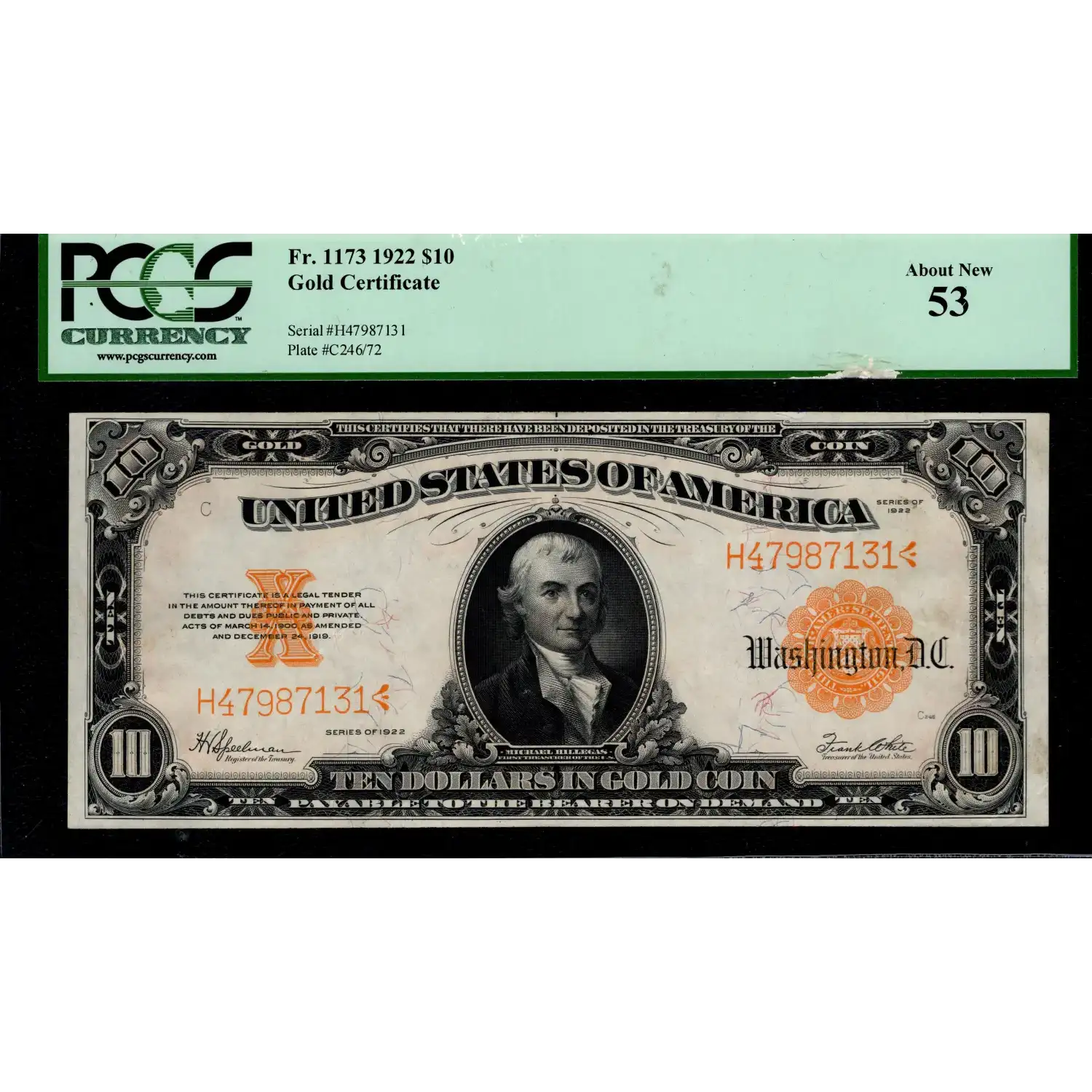 Exceptional color adorns this popular $10 1922 Gold Certificate featuring Michael Hillegas, the first Treasurer of the United States. This note features attractive and clean paper with a bold overprint and bright orange back. The note is entirely uncirculated except a single corner bend in the lower right corner which is barely visible from the face. As such, the note presents like a Ch CU example. It's an impressive feat to find an attractive survivor that remains entirely free of any problems or negative comments. Congratulations to the collector that secures this handsome Hillegas!