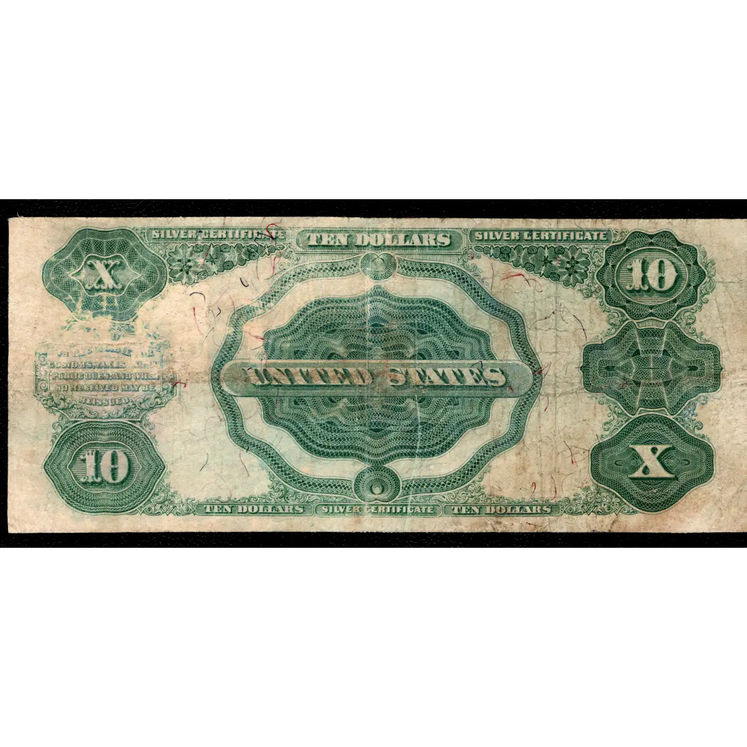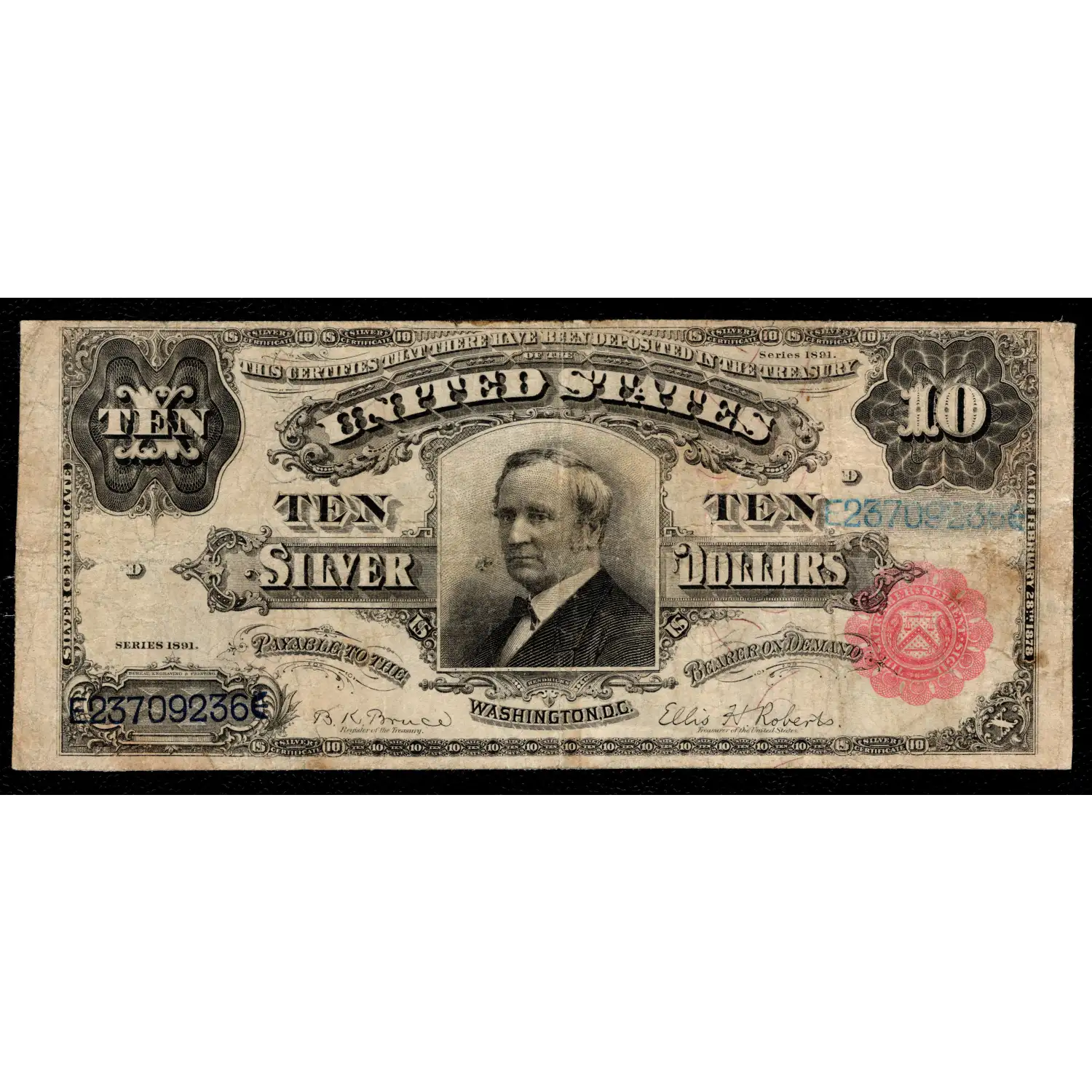 An incredibly cheap example of a popular note that quickly gets out of reach for collectors. This note is a pleasing mid-grade example that picked up a single and tiny pinhole. The note definitely sepnt some time trading hands, but escaped commerce without any objectionable flaws that so many survivors have. This is the second-rarest signature combination for the $10 1891 Silver Certificate and bears a pleasing small red seal with only 171 pieces in the census. This note has an established history of repeatedly bringing above $1k with some VF 25s selling above $2,000! Congratulations to the collector that secures this tremendous note at an even better value. As we just secured this note, we always encourage prospective collectors to look at both of the provided high-resolution scans to determine if it's an ideal addition to your collection.