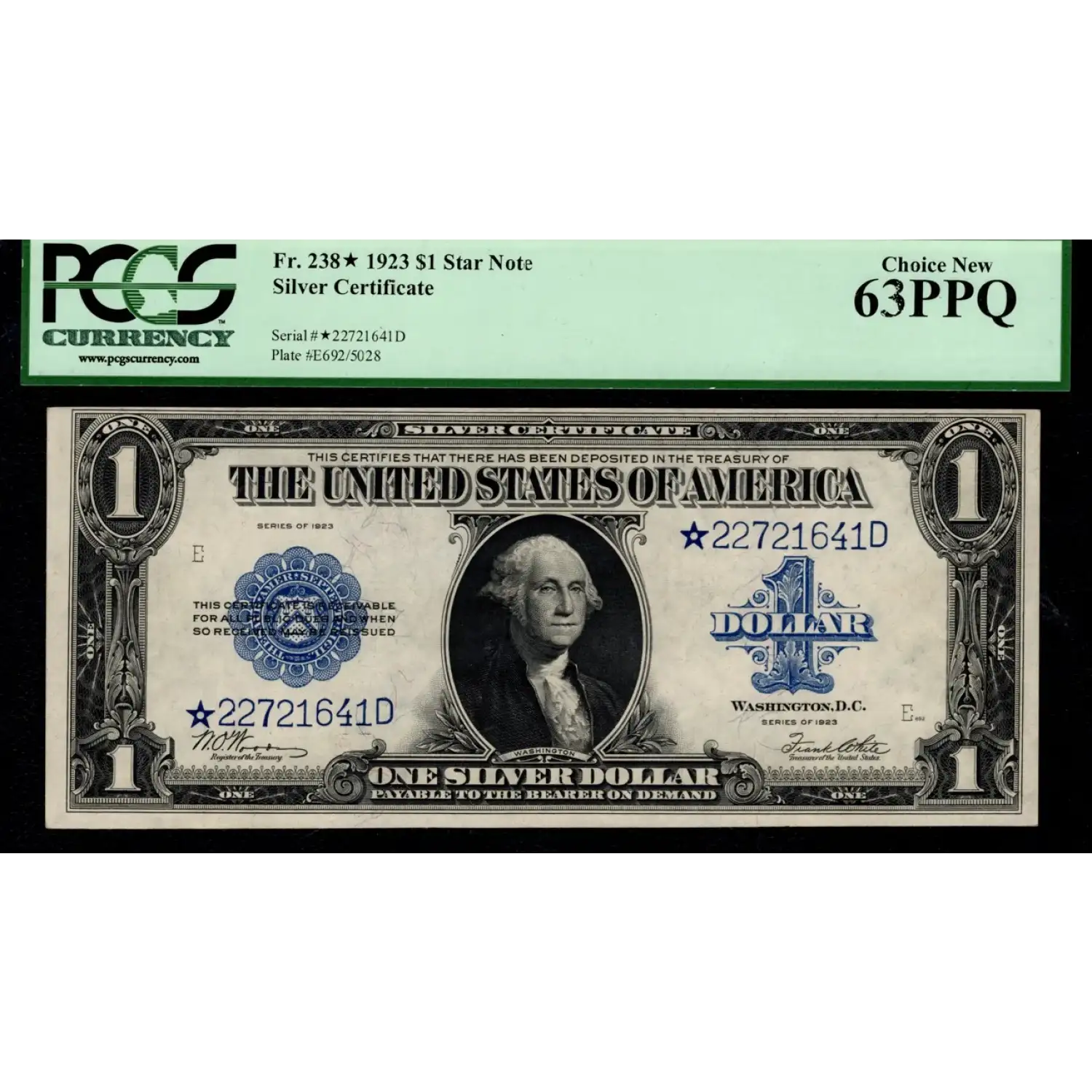 This nicely margined and fully-original Woods-White $1 1923 Silver Certificate STAR displays blazing ink colors and solid embossing. This is from the final series of Large Size notes making it one of the last large size replacement notes to have been printed! An excpetional opportunity offered cheap!