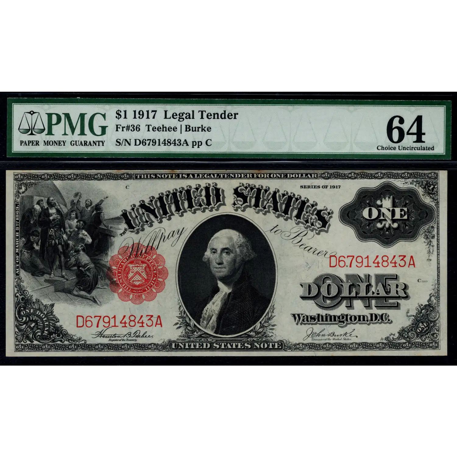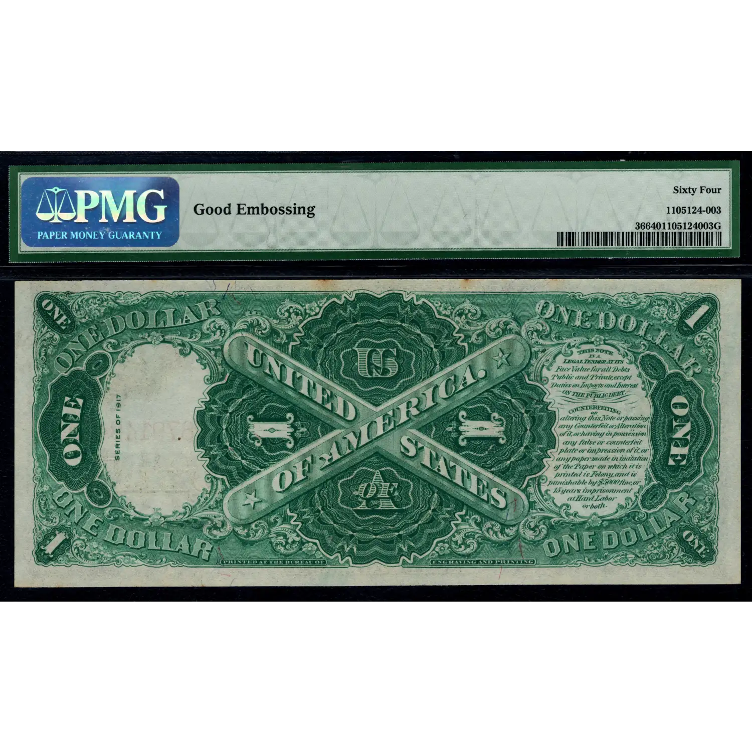 Bold ink colors and serial number embossing are the merits of this well preserved Legal Ace that received the positive comment "Good Embossing" from PMG on the back of the holder.
