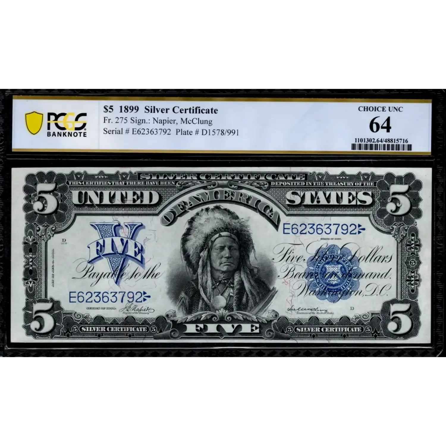 The bright paper, bold overprint and deep embossing stand out on this near-Gem $5 Chief. Evenly proportioned margins and a graceful paper wave round out an appealing presentation on this pretty Napier-McClung Chief. Congratulations to the collector that secures such a spectacular example of a stunning note!