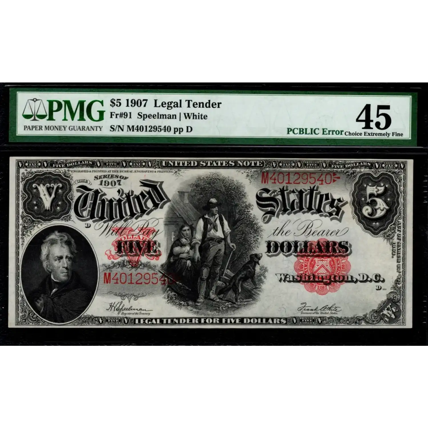 An absolutely gorgeous and seemingly uncirculated example of the iconic $5 1907 Woodchopper! This note faces up wonderfully with strong inks and terrific eye-appeal. On the right side of the back, this note has the popular PCBLIC / Public Engraving Error as it reads "For all debts pcblic and private." A common mistake offered at no premium.