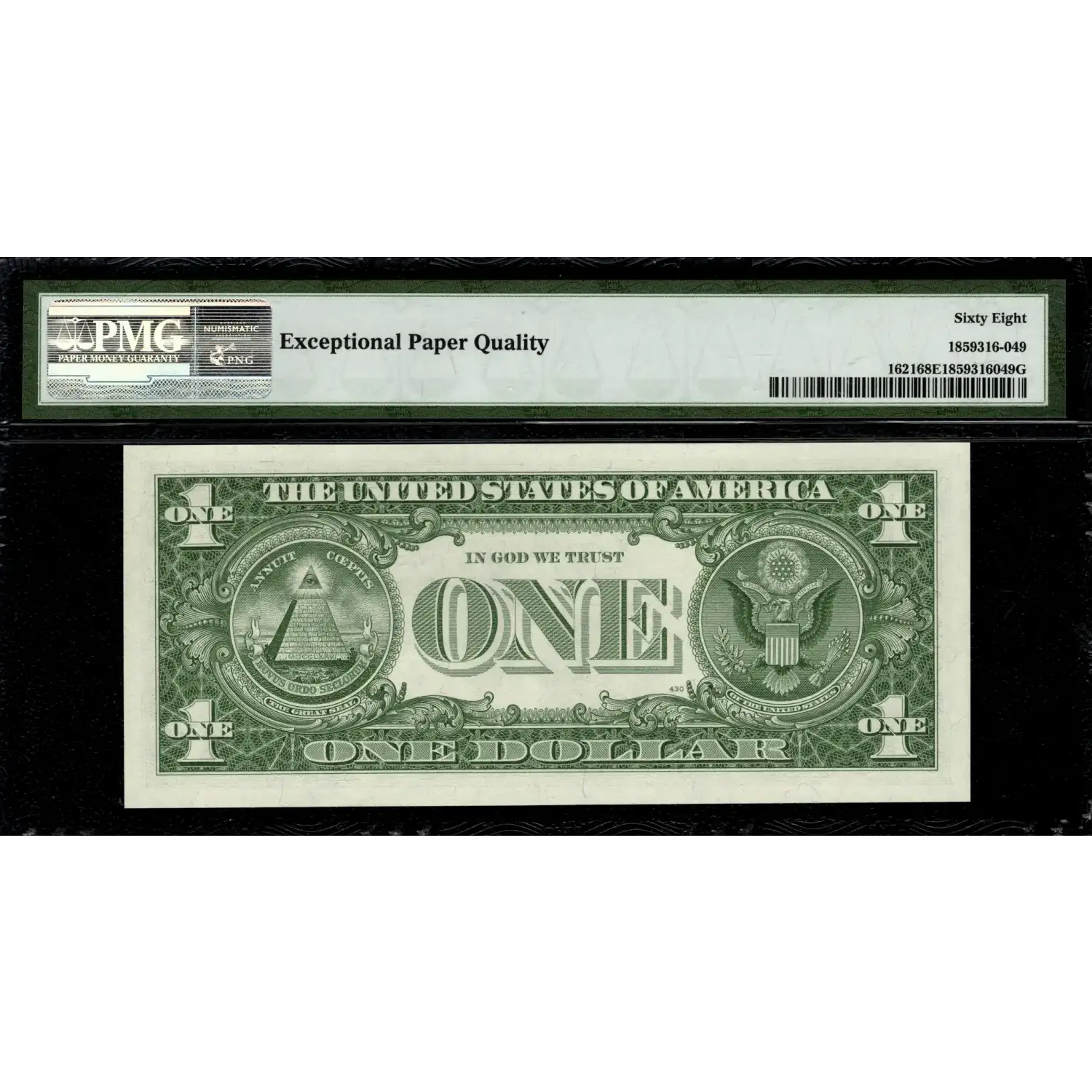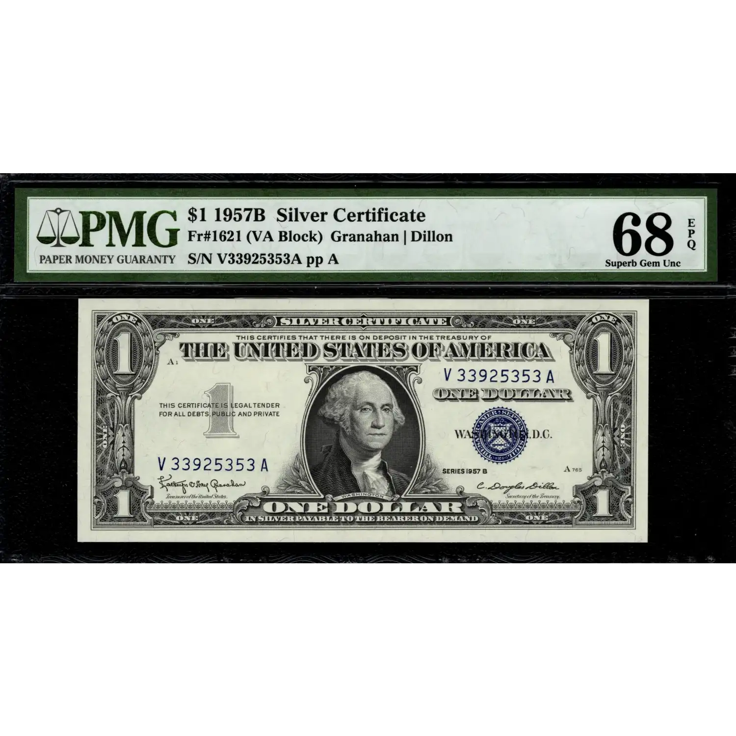 An exceptionally high grade example of the final series of $1 silver certificates. This 1957-B is identified as Fr. 1621 and displays eight even margins, original surfaces, and all requirements for earning the coveted Exceptional Paper Quality designation.