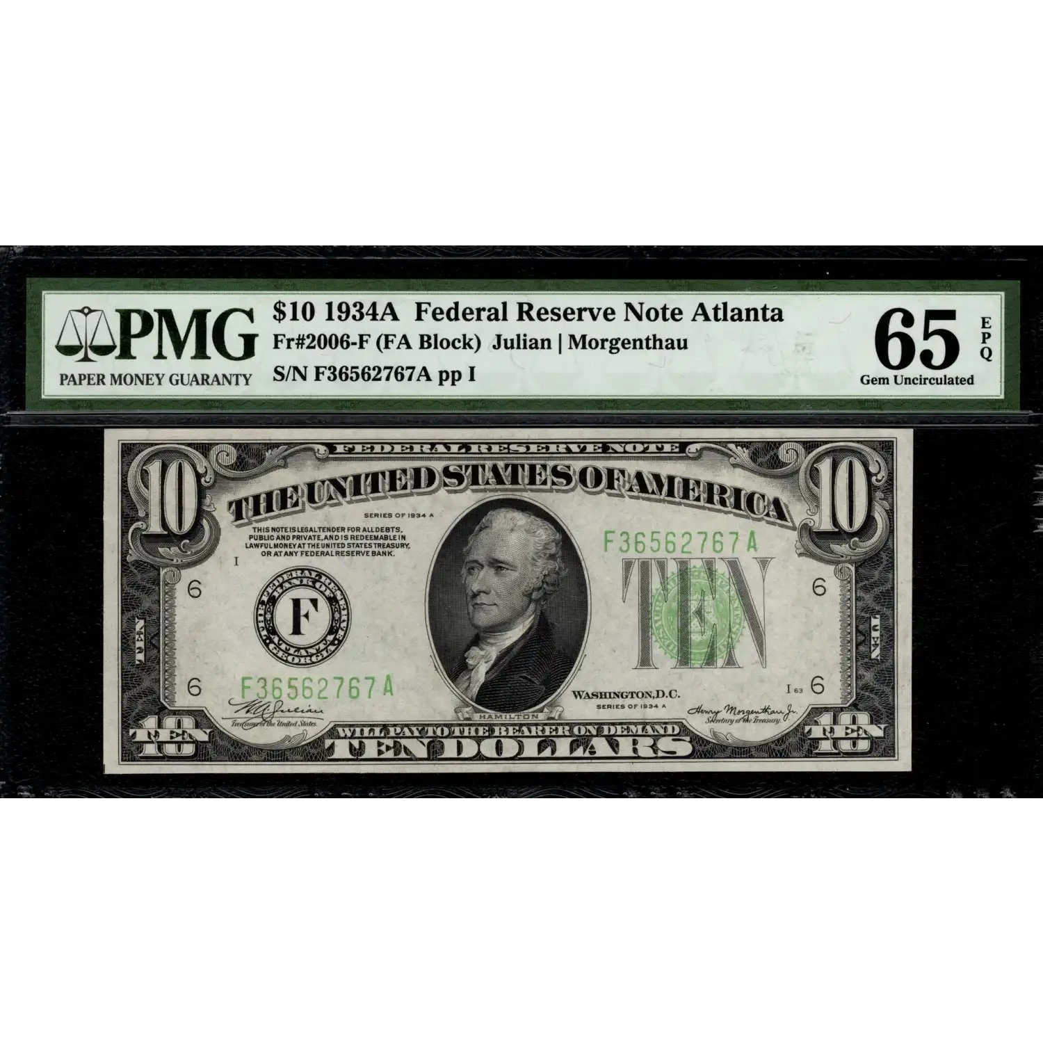 An affordable and attractive an early ten dollar Federal Reserve Note. This $10 1934-A FRN is from Atlanta and has been preserved in pristine and fully-original Gem condition!