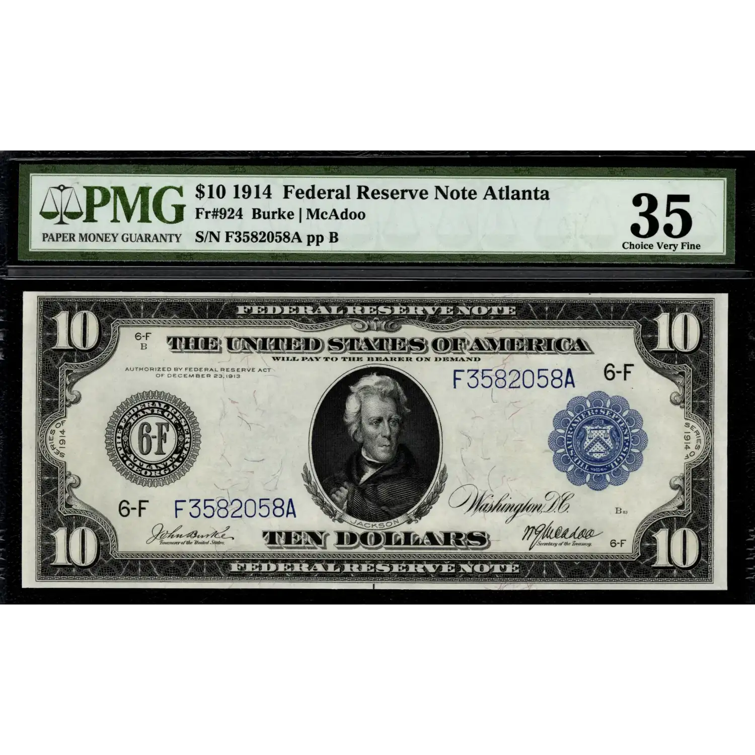 Excellent color and serial number embossing are easily seen on this well margined Atlanta $10 that saw only limited circulation.