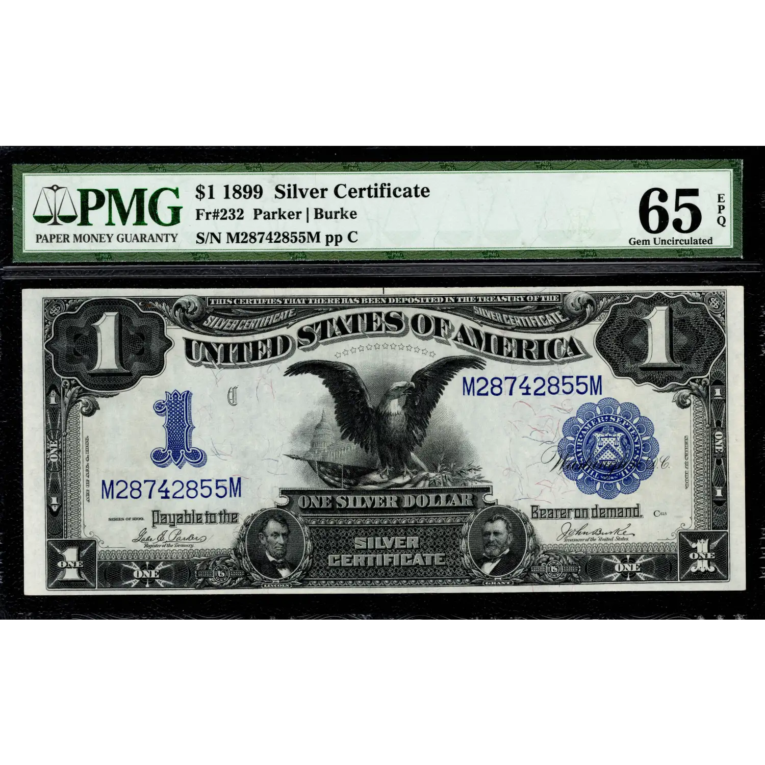 A stunning and fully-original Black Eagle with bright paper, bold inks, and well-balanced margins are highlights of this stunning Parker-Burke Silver Certificate Ace from 1899. This note looks as though it were just printed and is seemingly perfect!