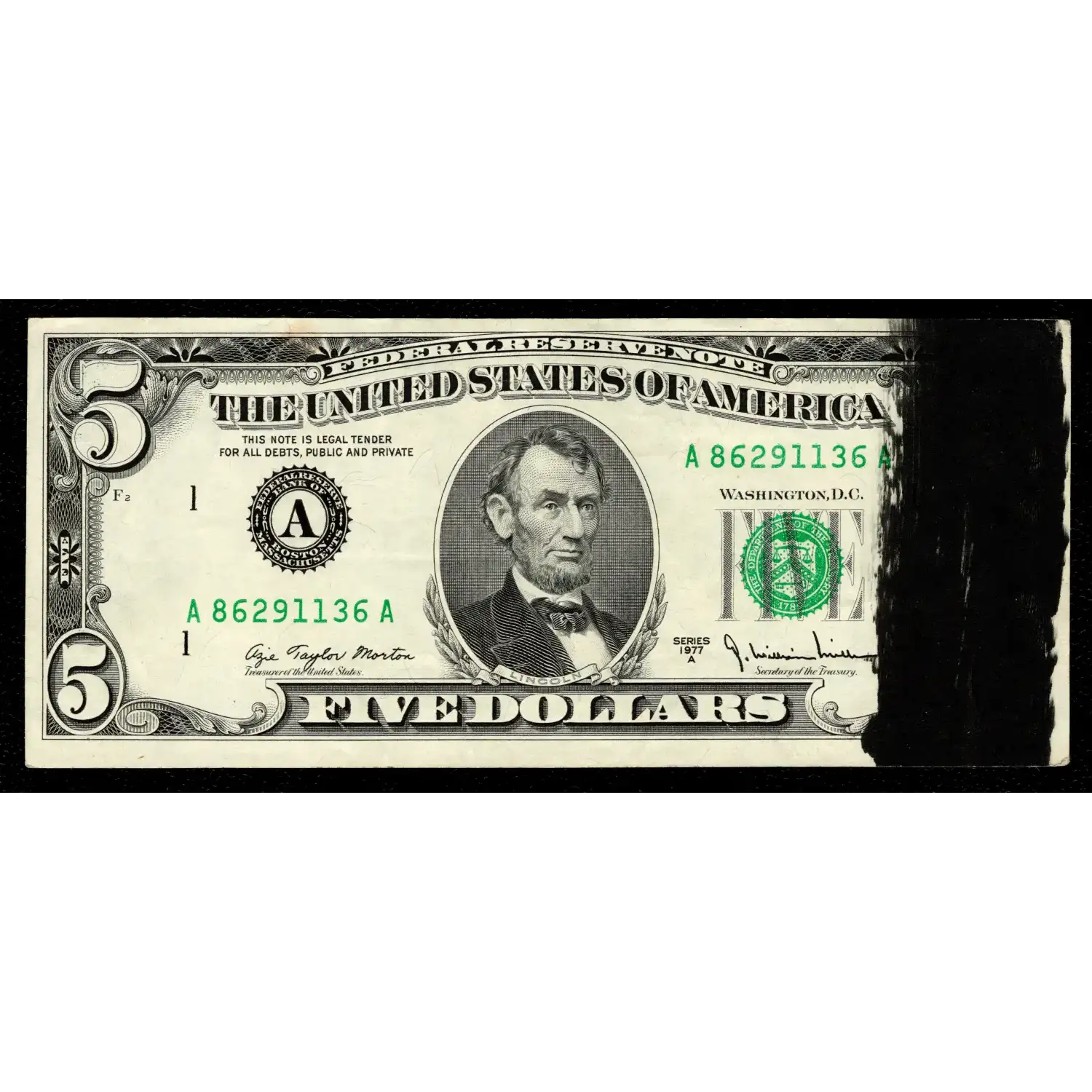 Wow! A huge veritcal ink smear spans across the right side of the note affecting three of the four margins! There is a small spot in the top margin that's not objectionable and barely noticeable -- especially with this GIANT INK SMEAR!