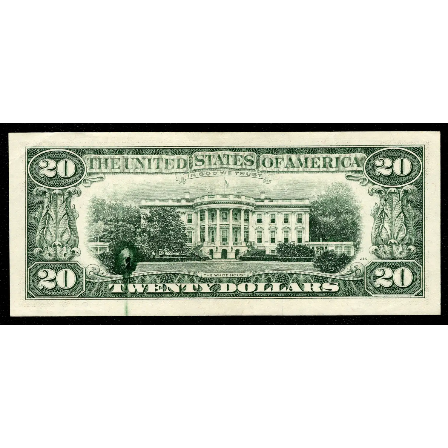 Although a seemingly minor mistake, this overinking/ ink smear error is actually quite impressive and unusual! Not only is there a circular smear featuring dark green ink from the back, there is a thick blob of layered ink inside which creates a "target" near The White House design on the back. Tougher denomination with the small-head design, but the real impressive nature of this note is the shape and series of smears.