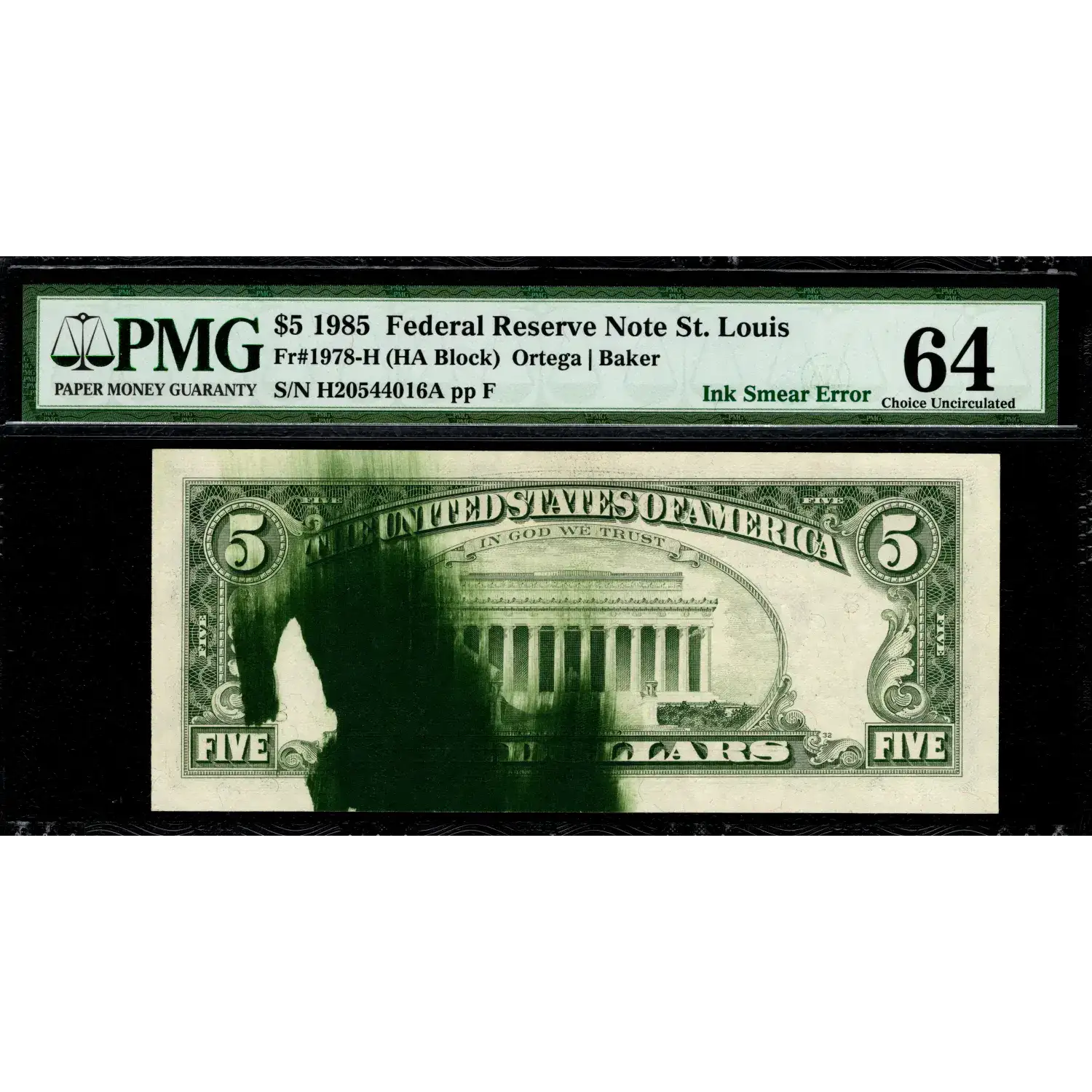 Have you seen an ink smear like this? Check out this unusual shape that's left an exciting void as the left side of the note has this excess ink smeared across it. There are two tiny pinholes above Lincoln's portrait that are barely noticeable only when backlit. The margins on the error-side are enormous and seeminlgy superb!