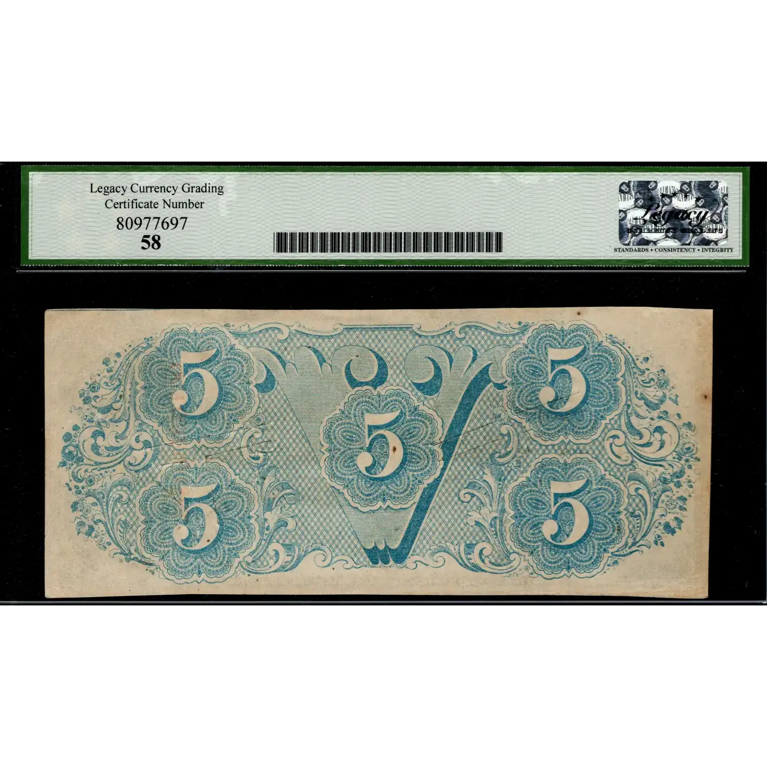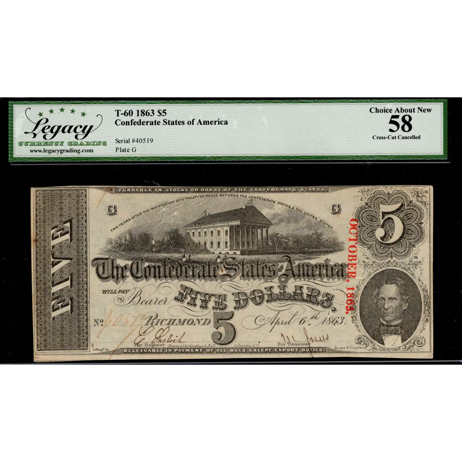 Bright color on both the red date stamp on the face and the blue back as well as boldly printed design details are traits of this fully-framed Five Dollar Confederate that features the bust of Secretary of theTreasury, C.G. Memminger. This example has been cross-cut cancelled.