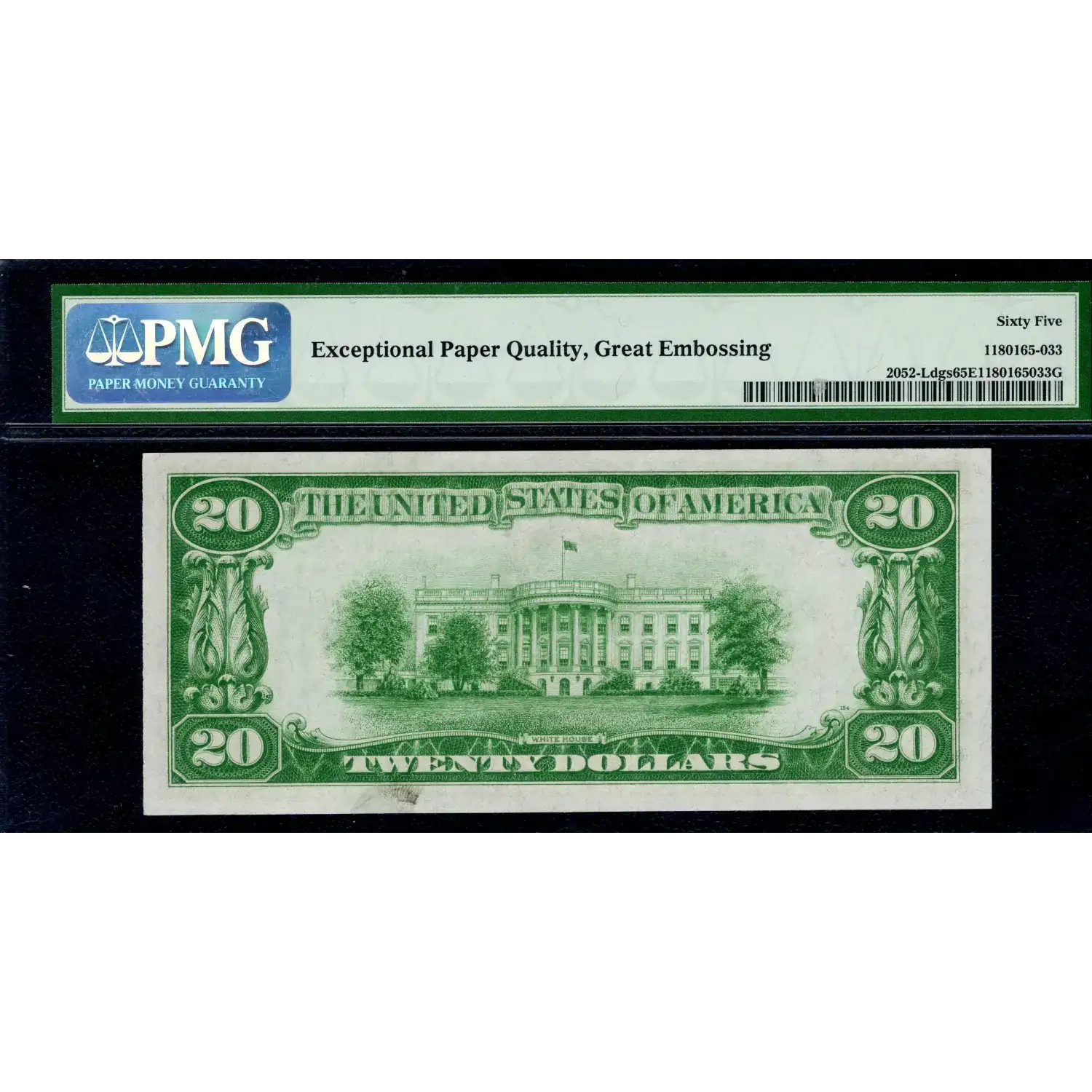 An exceptional and early twenty dollar Federal Reserve Note with the always sought-after "Redeemable in Gold" clause. Generous and even margins along with original surfaces are highlights of this San Francisco Gem! Few notes earn the "full grade" but simply calling it Gem Unc 65 EPQ wasn't enough for this trophy...the graders commented "Exceptional Paper Quality" AND "Great Embossing" on the back of the holder.