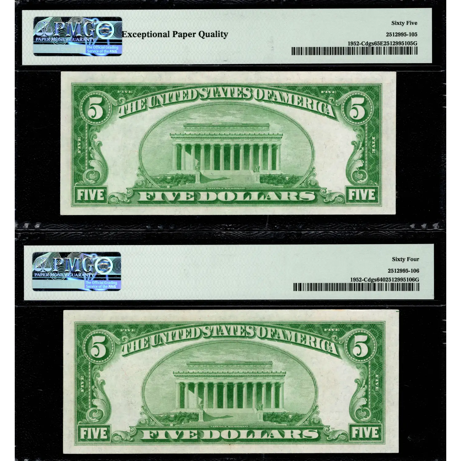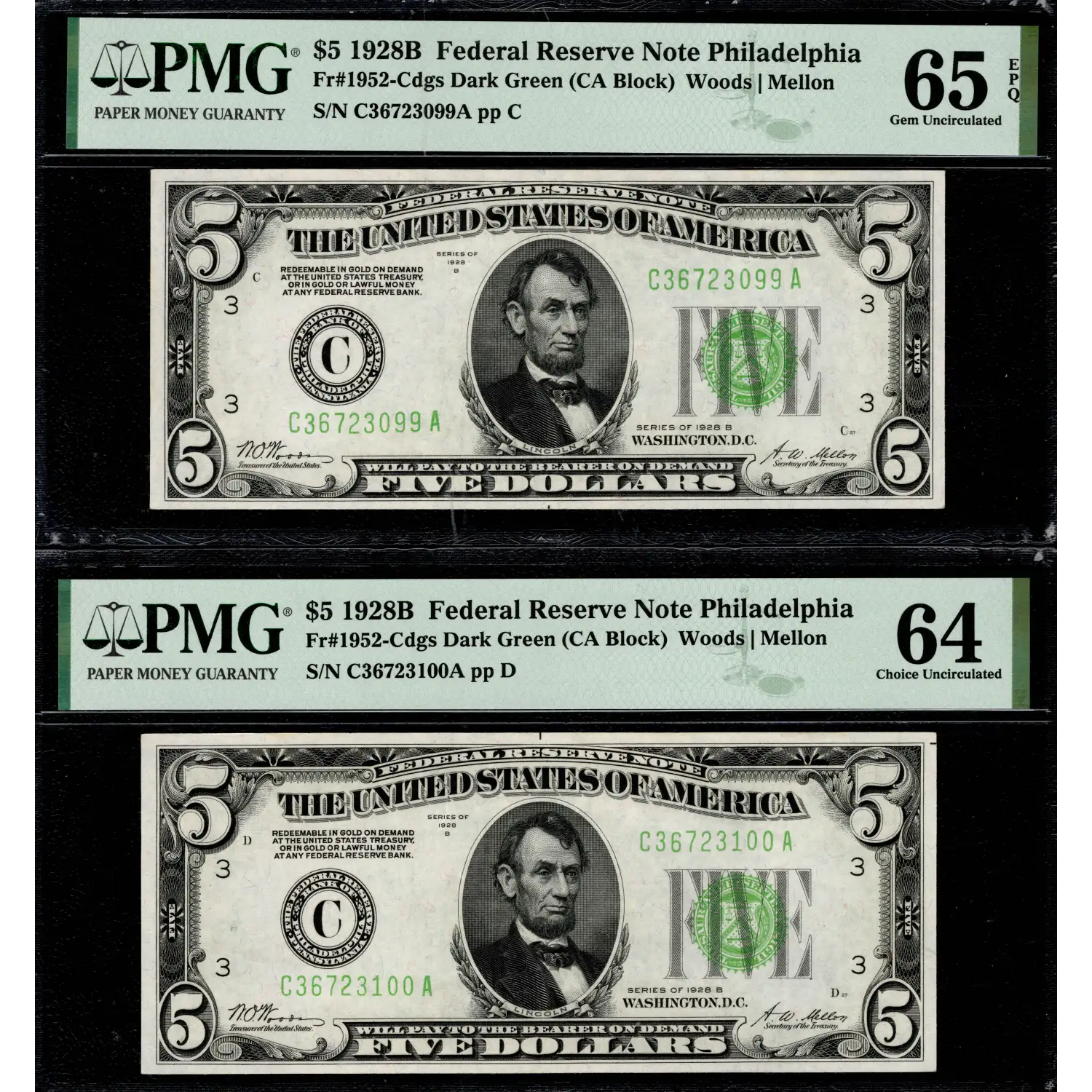 A remarkable pair of $5 1928-B Federal Reserve Notes from Philadelphia featuring the coveted "Redeemable in Gold" clause along with the Transitional Green Seal and serials on this sequential pair of high-grade fives. Having a single Redeemable in Gold Philly is exciting, but securing a consecutive pair is simply impressive.