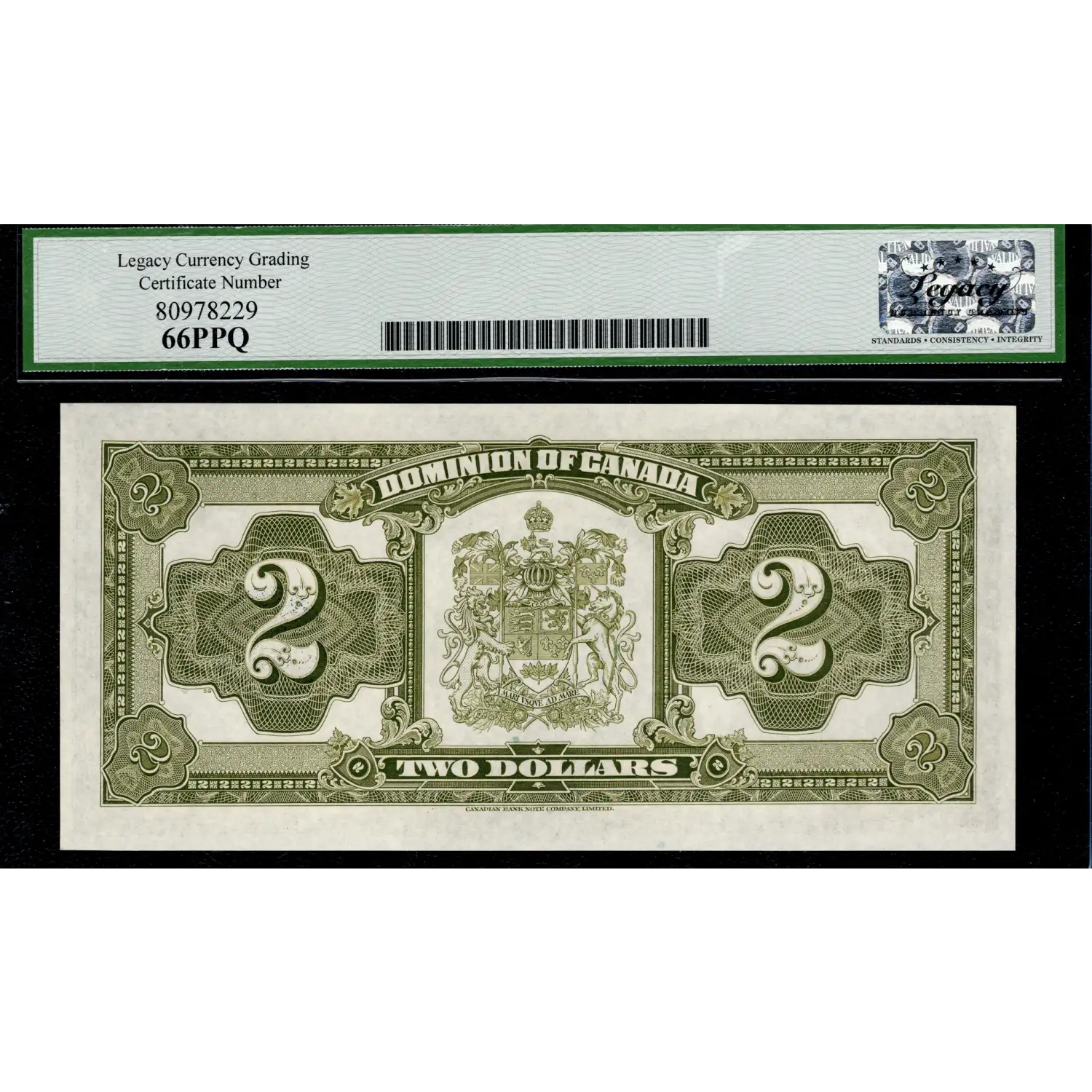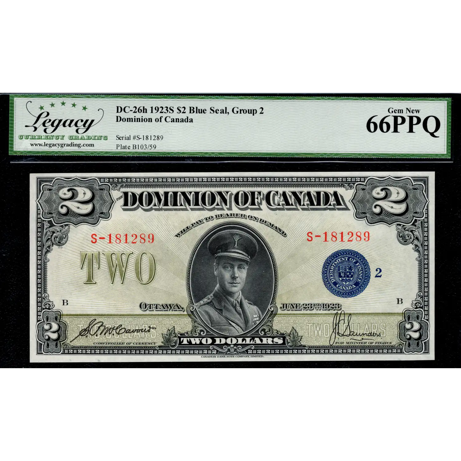 $2 1923 Dominion of Canada DC-26h FINEST KNOWN Blue Seal S Prefix LCGS Gem 66PPQ